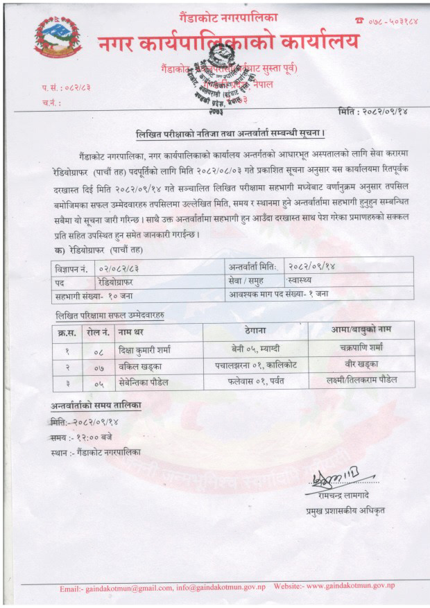 » रेडियोग्राफर पदको लिखित परिक्षाको नतिजा तथा अन्तर्वार्ता सम्बन्धी सूचना २०८२/०९/१४