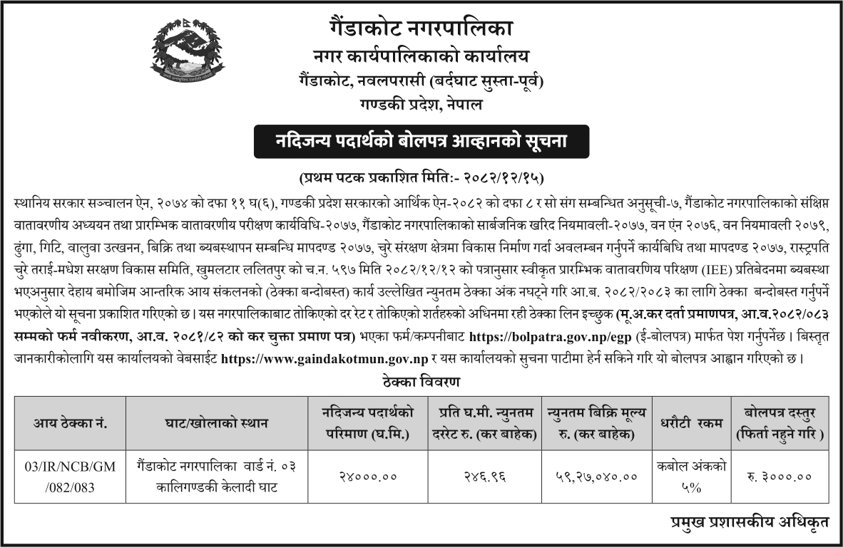 नदिजन्य पदार्थको बोलपत्र आव्हानको सूचना २०८२/१२/१५