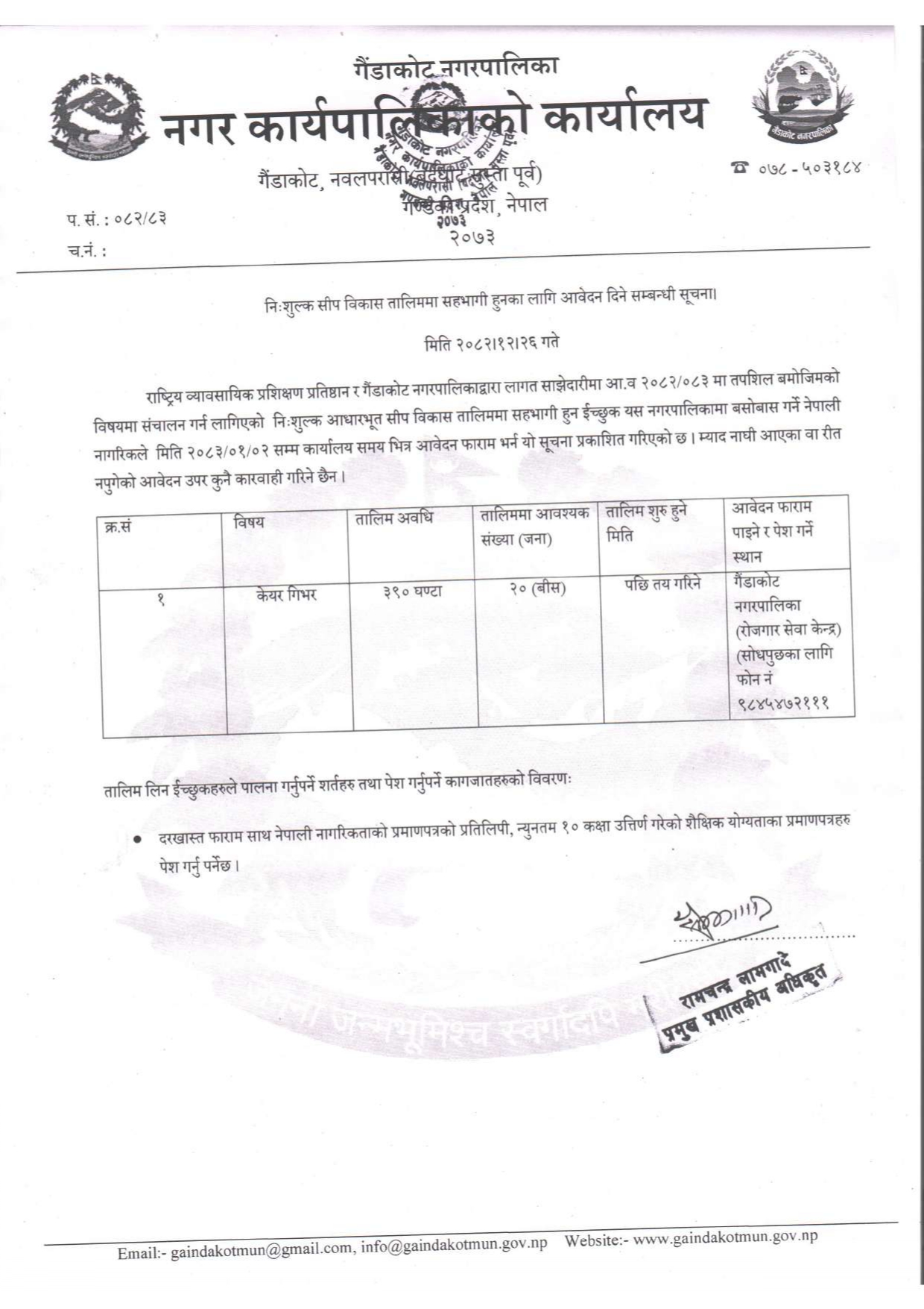 गैंडाकोट नगरपालिकाको नागरिक वडापत्र २०८२/०८३